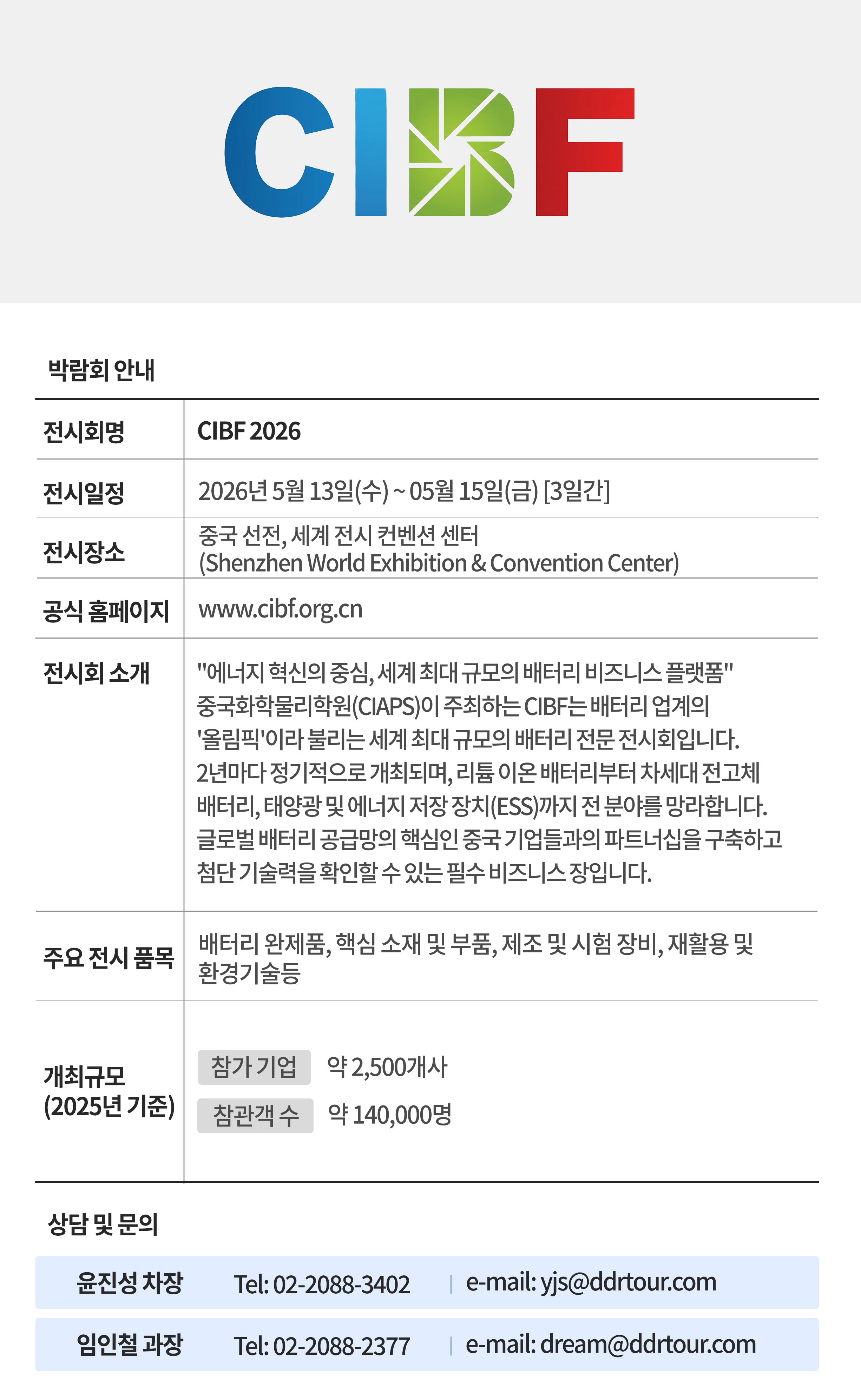 ➡️ 전시회명 : CIBF / 중국 국제 배터리 박람회 ➡️ 개최기간 : 2026년 5월 13일(수) ~ 5월 15일(금) ➡️ 개최장소 : 중국 선전, 세계전시컨벤션센터 (Shenzhen World Exhibition & Convention Center) ➡️ 홈페이지 : www.cibf.org.cn/en-US