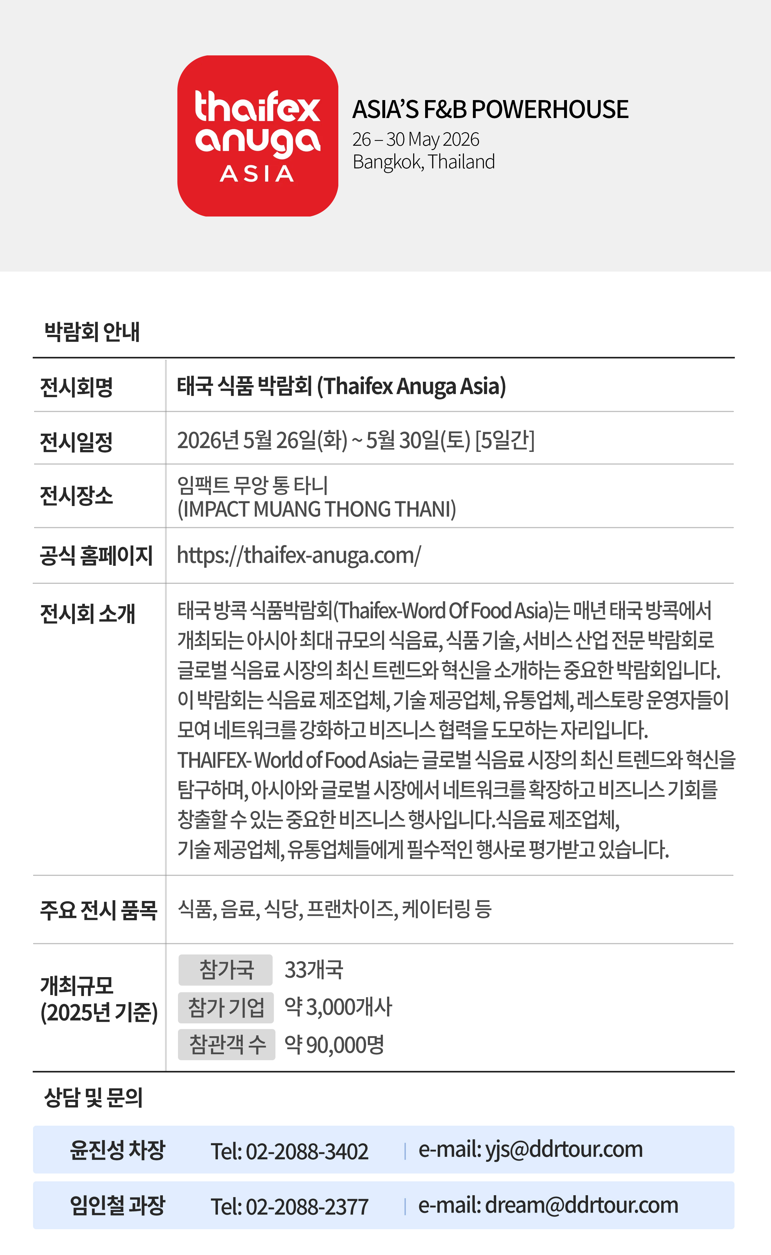 ➡️ 전시회명 : Thaifex Anuga Asia / 태국 식품 박람회 ➡️ 개최기간 : 2026년 5월 26일(화) ~ 5월 30일(토) ➡️ 개최장소 : 임팩트 무앙 통 타니 (IMPACT MUANG THONG THANI) ➡️ 홈페이지 : https://thaifex-anuga.com/