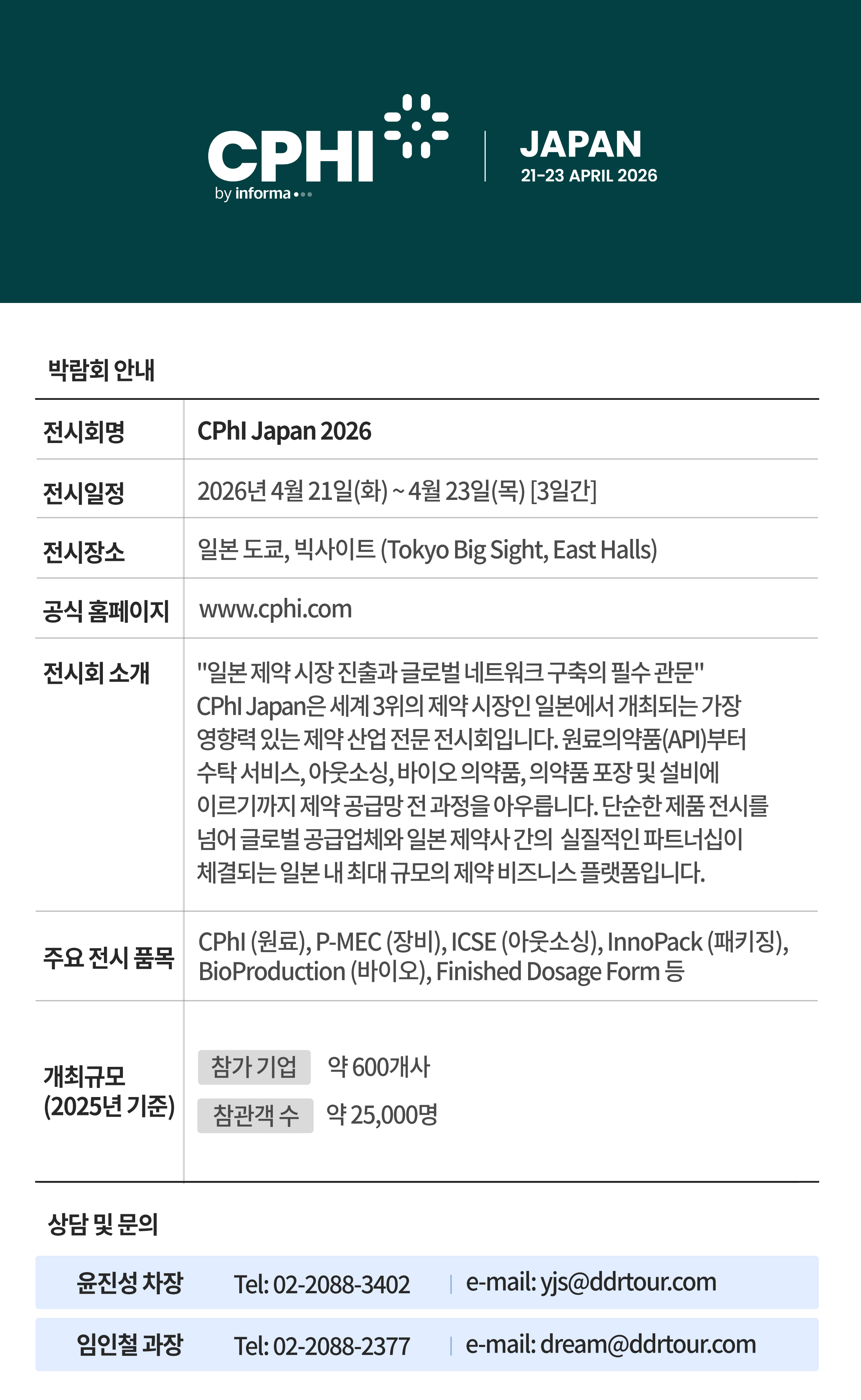 ➡️ 전시회명 : JAPAN DRUGSTORE SHOW / 일본 드럭스토어 쇼 ➡️ 개최기간 : 2026년 7월 31일(금) ~ 8월 02일(일) ➡️ 개최장소 : TOKYO BIG SIGHT ➡️ 홈페이지 : www.drugstoreshow.jp