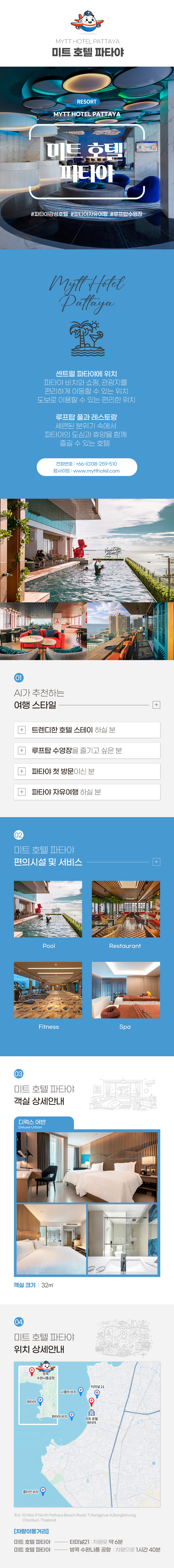 파타야 북부 비치로드에 위치한 모던 감성의 5성급 호텔로, 파타야 해변과 주요 관광지와 가까워 편리한 위치를 자랑합니다. 세련된 디자인의 객실과 루프탑 인피니티 풀, 레스토랑, 스파 등 다양한 부대시설을 갖춘 도심형 휴양 호텔입니다. 쇼핑몰, 레스토랑, 엔터테인먼트 시설과 인접해 있어 휴양과 관광을 동시에 즐기기에 좋습니다.